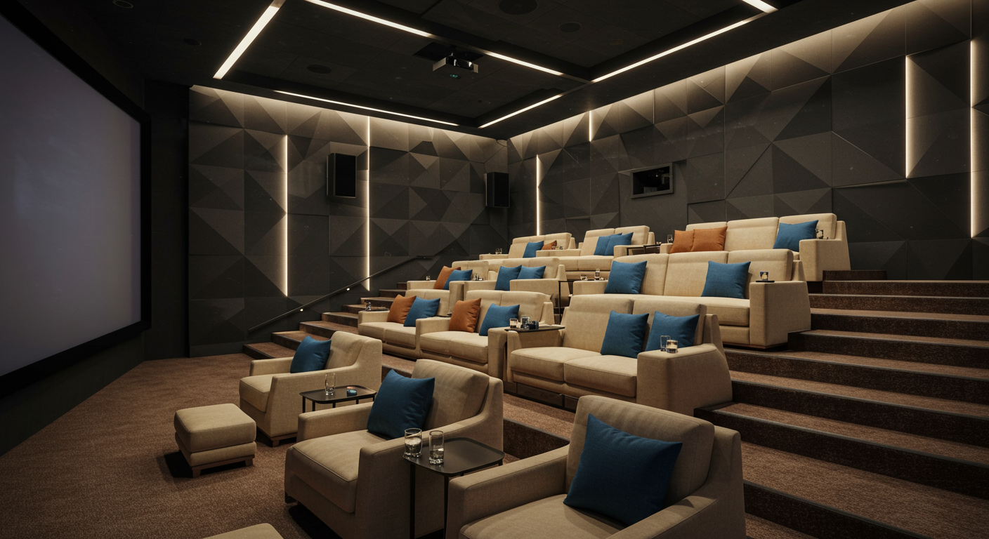- Movie Theater with plush seating for 14 people designed to mimic a Bentley car interior